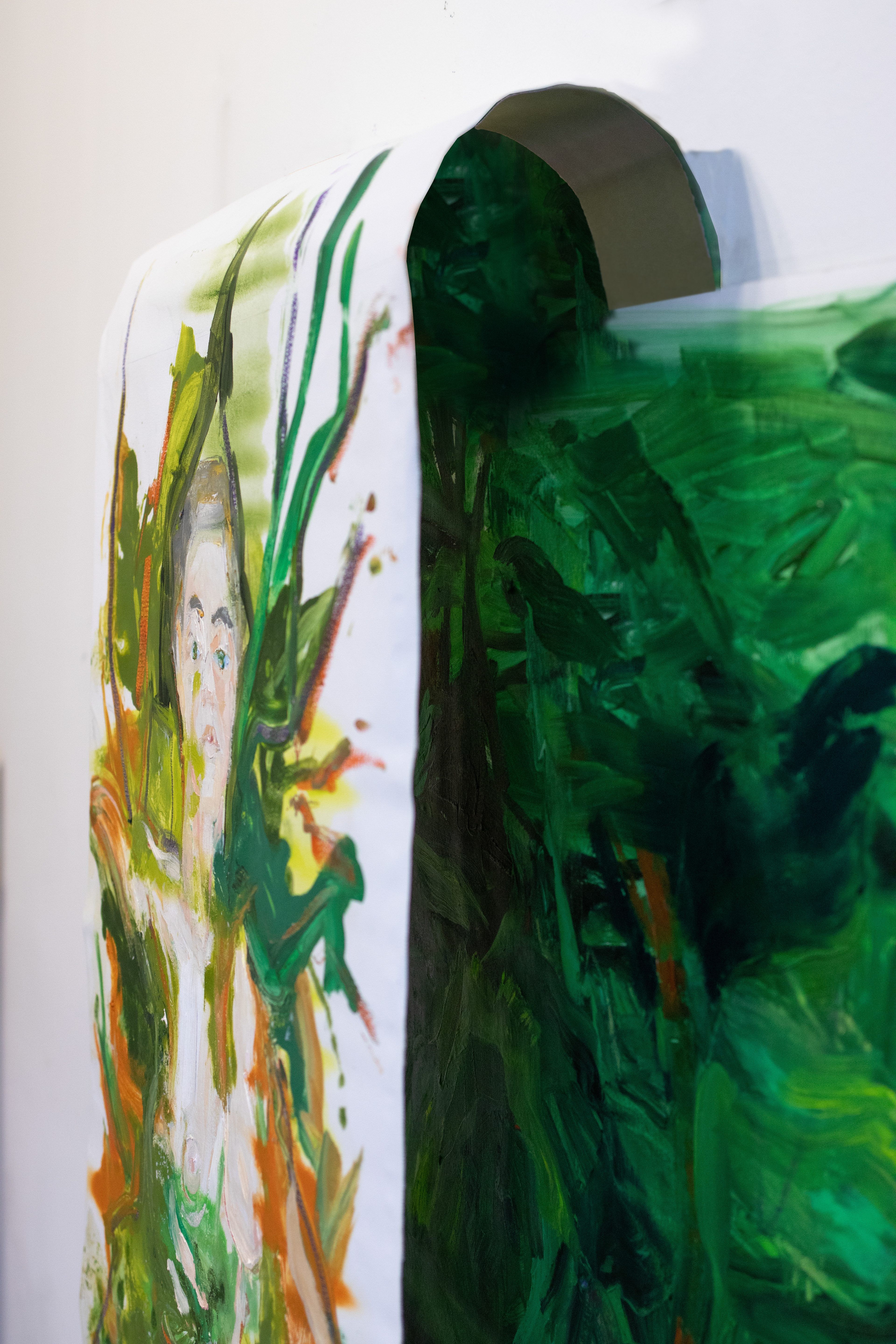 The work will be executed on both sides of a single canvas. The upper part folds forward,